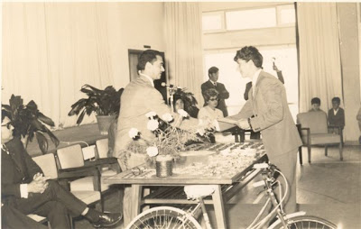 É agradável reviver estes momentos, ainda por cima no dia em que faço 31 anos de casado ... com a mesma, que já era namorada na altura.O prémio, oferecido pelo Rotary, foi-me entregue pelo Sr. Figueiredo Lopes e era uma "notinha" de 500 escudos, amarela e novinha. Na foto, veêm-se as professoras Isabel Correia e Elvira Bento Monteiro e, ao fundo, o Mestre Pólvora, com quem nunca tive aulas, mas sobre quem se faziam alguns comentários não muito abonatórios.